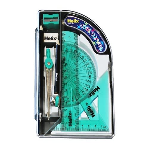 The Helix Cool Curves maths set is a great value set ideal for students for use in school, university or at home.Includes: & bull; Self-centring Compass with safety point & 9cm pencil & bull; 45 & deg; & 60 & deg; set squares & bull; 180 & deg; Protractor & bull; 15cm Ruler & bull; Pencil Sharpener & bull; Eraser & bull; 17.5cm PencilThis Helix mathes set is ideal for children starting secondary school and students studying maths, geometry an trigonometry.