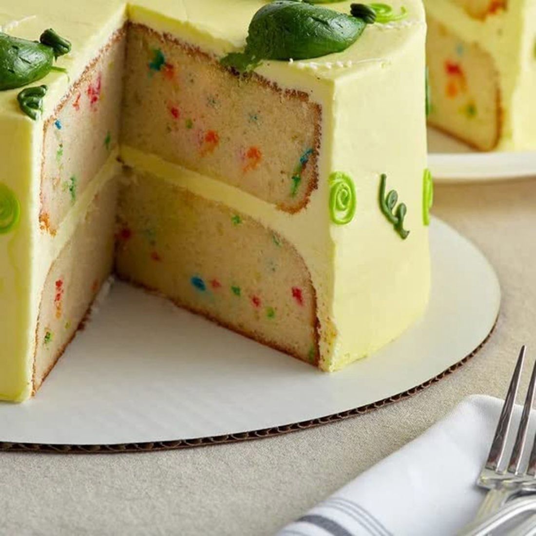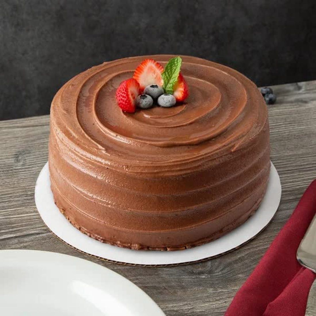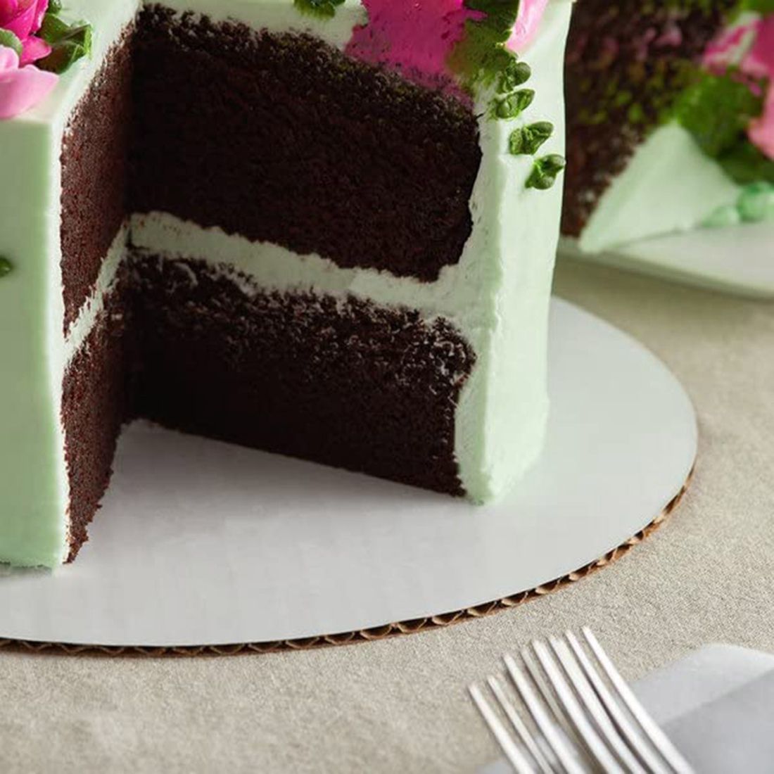 BRIGHT WHITE COLOR - the circle's top features a crisp, white coloring that ensures your vibrant, colorful icings and intricate designs stand out for a stunning appearance. This cake circle is also rated food safe for direct contact on the kraft side making this item reversible.
