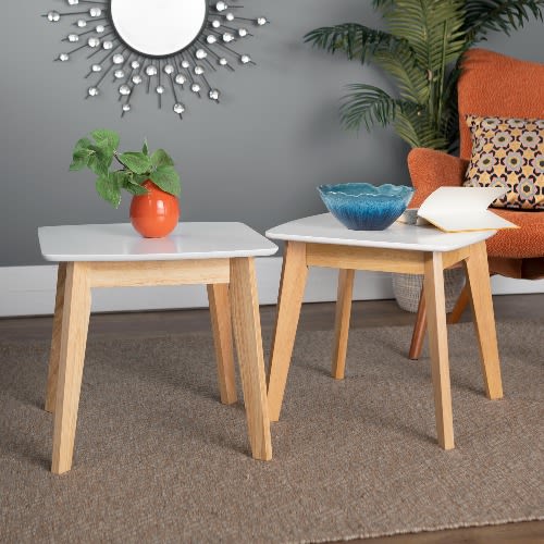 Set of 2. Sturdy sound construction. Versatile design. Made from solid wood, high-grade painted MDF. Minimal assembly required. 20 in. W x 20 in. D x 18 in. H (12 lbs.). Weve got a little bit of nostalgia in all of us; channel yours with our brand new retro modern end table. It's the perfect combination of past and present to tie together your living space. Versatile enough to fit the living room, office, or bedroom making these the perfect addition to your home.