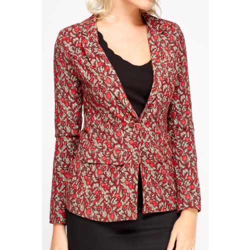 In a lovely shantung fabric, this jacket features princess seams with piping around the neckline. It has a matching corded feature button and contrast satin piping inside, and pairs perfectly with our matching skirt and Monet print items