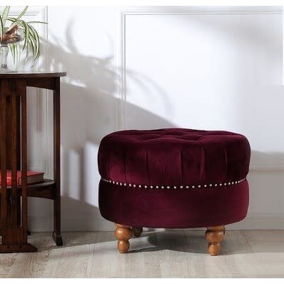 This is a striking and elegant footstool. Buttoning adds texture and shape as well as the right amount of opulence. In a soft, high-quality fabric with dark stain legs, this footstool is perfect for resting your feet or perching your tea set in style.
