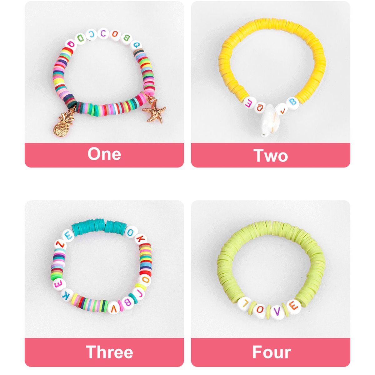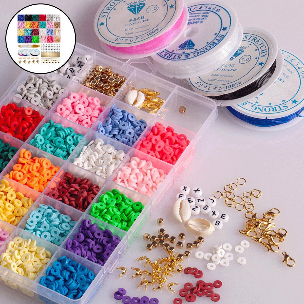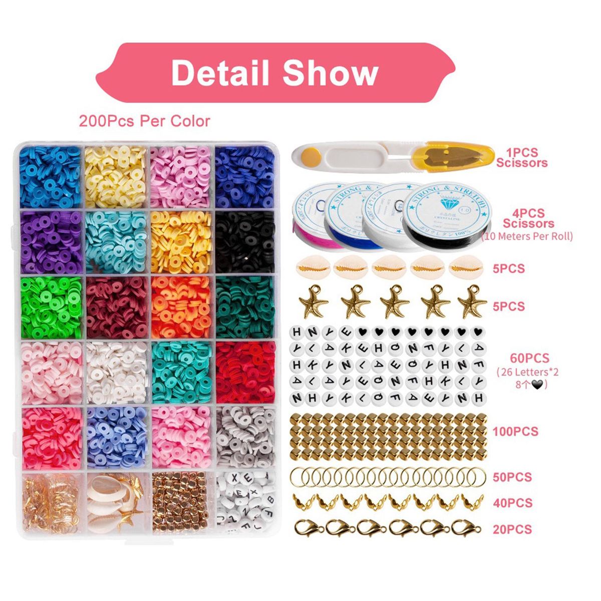 INCLUDE - 20 colors ceramic pieces, 200pcs each, 52 mixed letter beads, beads, 100 square beads, 40 clasps, 20 snap rings, 50 round clasps, 5 shells, 5 star pendants and 4 rolls of elastic thread(10m), 1 and 1 storage box.