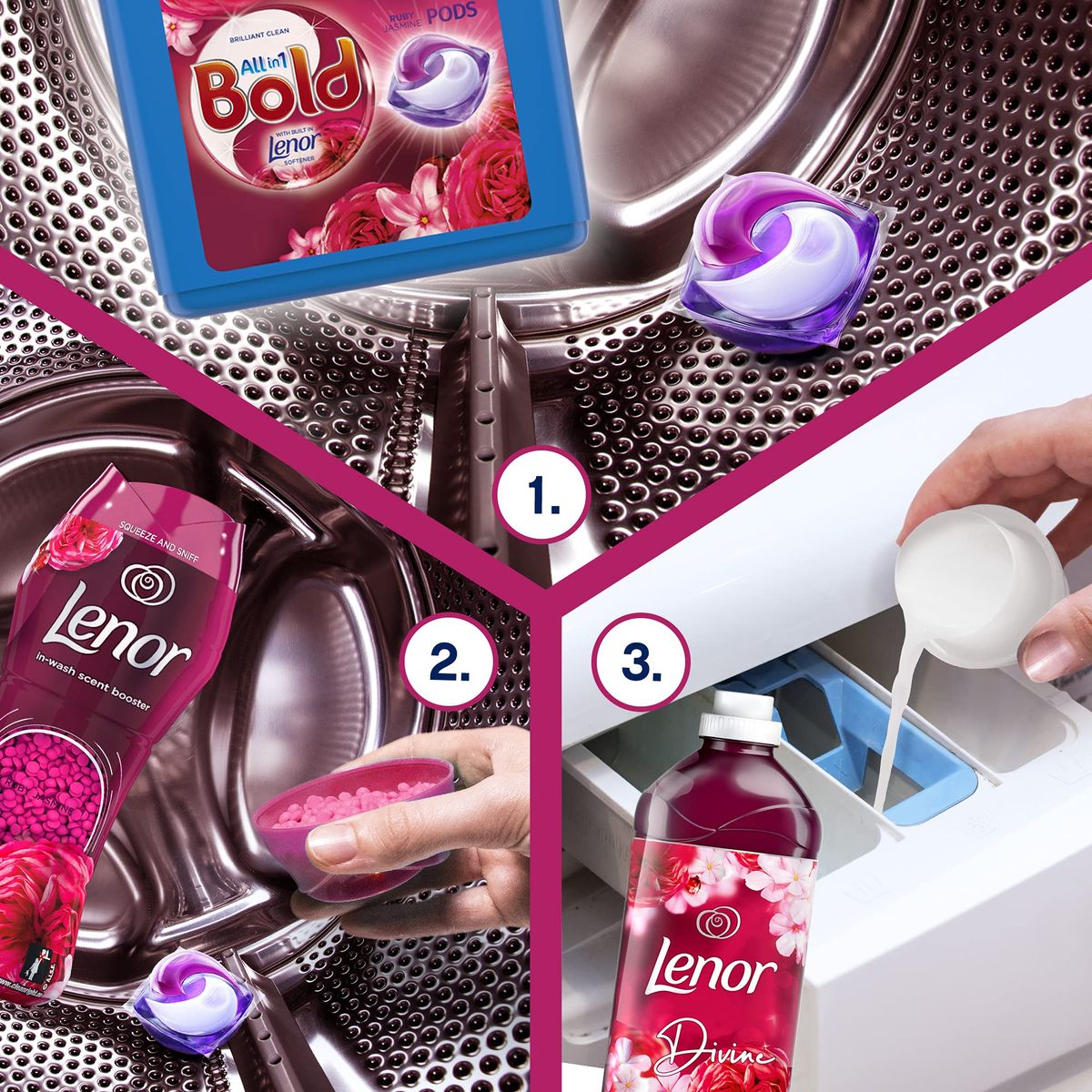 conditioner provides softness, freshness and protection for the clothes you love and also helps with less wrinkling and easier ironing. For brilliant cleaning and fabulous freshness, use together with Bold All-in-1 Pods and Lenor In-Wash Scent Boosters - it's your Laundry Dream Team! Embrace your inner goddess. Reveal your divine femininity with a lush blend of premium red fruits and luxurious florals. Fabric conditioner that gives a premium long-lasting fragrance, with fresh sheets for up to a whole week (noticeable Lenor freshness for up to 1 week) Provides a conditioning softness for fabrics with less wrinkling and easier ironing. Provides fabric protection against stretching, fading and bobblingBottle made from 50% recycled plasticsUse in combination with Bold detergent and Lenor in-wsh scent booster for a deep clean and matching scent