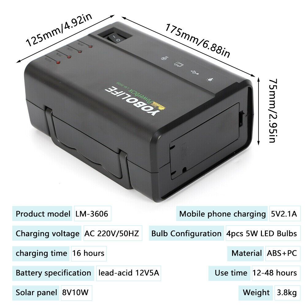 Model NO.: LM-3606 Illumination Time: 10-20 Hours Cell Type: Lead Acid 12V 5A Battery Charging Time (H): 10HoursUsage: Garden, Street, Home Voltage: 12/24VLED Bulb Quantity: 4 PCS Solar Panel Power: 15 W Battery Size: 3.2V 5200mAh Color: Black+AC Wide Voltage: 110-240V DC Voltage: 12V USB Output: 5V 2.1A