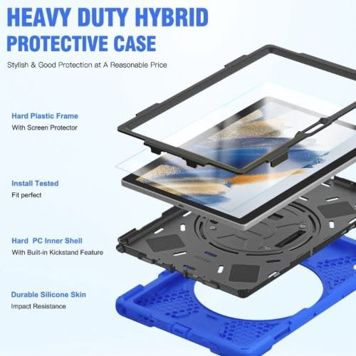 Strike Rugged Case with Hand Strap and Lanyard for Samsung Galaxy Tab A9 offers dual-layer protection to guard your device against dust, dirt, shocks, scratches, and dents. It features a handy built-in kickstand for convenient horizontal or vertical viewing, a secure hand strap for easy gripping, and a detachable shoulder strap with a soft pad to rest comfortably on your shoulder. Enjoy the freedom of carrying your device hassle-free wherever you go with the Samsung Tab A9 protective case