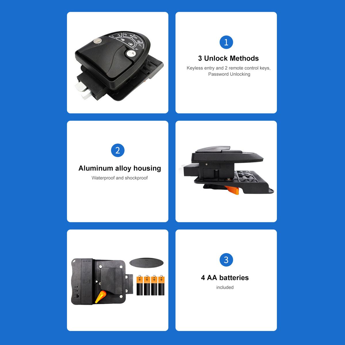 Features:3 Unlock Methods: This RV Keyless Entry Door Lock is equipped with 4 keys and 2 remote control keys, Password Unlocking. providing multiple unlocking methods, making it convenient and .