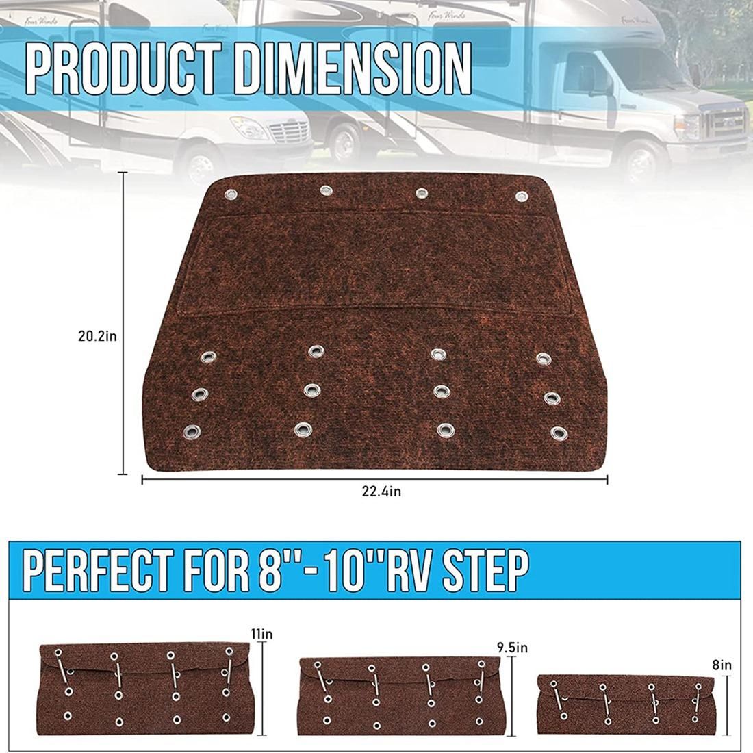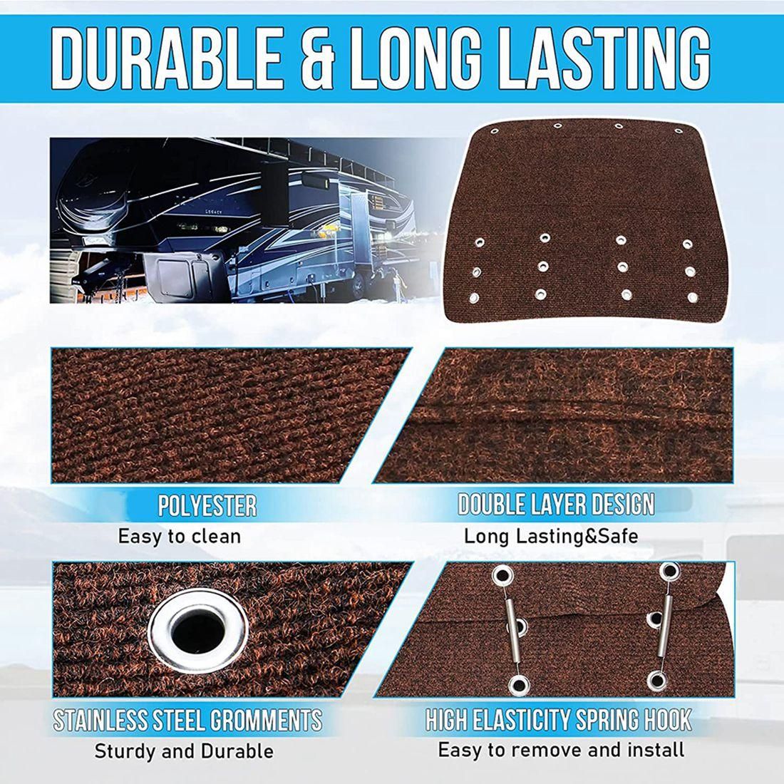 [Suitable for 8 - 11 inches (about 20.3 - 27.9 cm) RV stairs]Can cover a depth of 8 - 11 inches (about 20.3 - 27.9 cm). Each camping pedal rug comes with 4 sets of paired grommets and springs that you can adjust the depth for three different step depths. Perfect fit for your straight stairs.