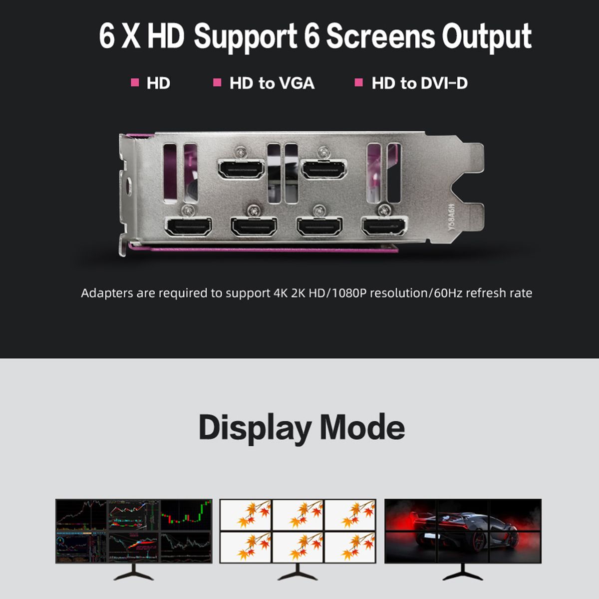 ▶ Design with 6pcs High Definition Multimedia Interface Ports, support 6 screens of output. (Adapters are required to support 4K /2K HD/1080P resolution/60Hz refresh rate)
