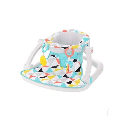 This Fisher-Price Sit-Me-Up Floor Seat is cute, convenient, and oh-so-cozy for your little person. It helps support your baby as you sit them up to interact with the world around them (Hello, world!). The soft fabrics and wide base help babies relax in cushy comfort, as they reach out and interact with the linkable toys. Plus, it folds flat for easy stow or go, and the seat pad is removable and machine washable! Where development comes into play Sensory: The seat's soft fabrics, bright colors, and exciting toys engage your baby's developing tactile and visual skills. Gross Motor: Colorful toys encourage your little one to reach and bat, exercising those little muscles. Security & Happiness: A comfy and supportive upright seat lets your baby see and interact with their surroundings. Use only with a child who is able to hold head up unassisted and who is not able to climb out or walk.