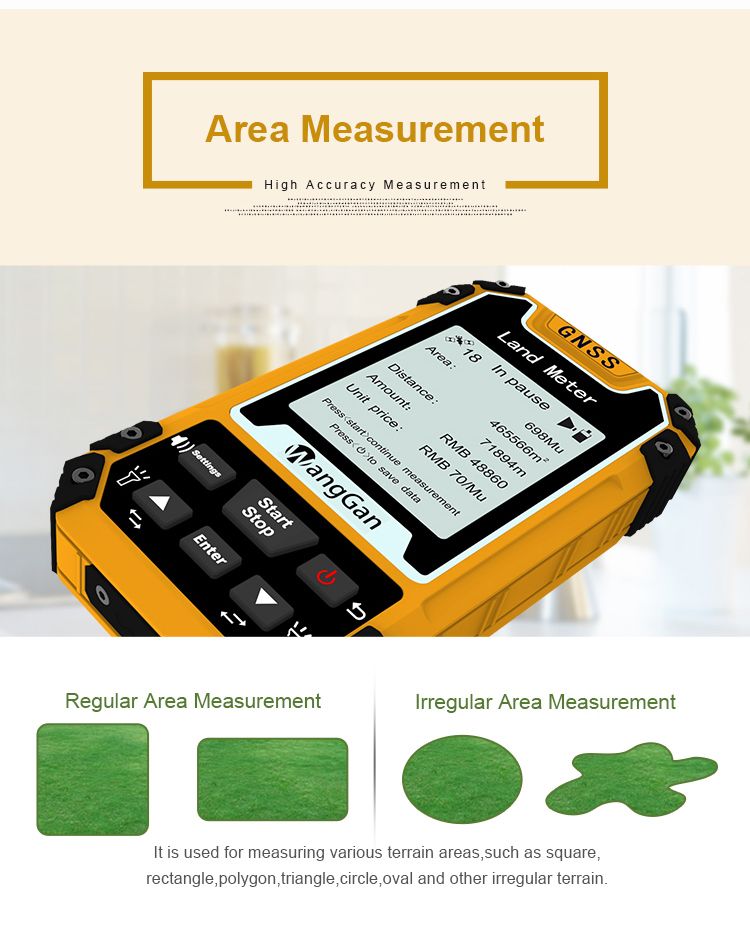 Specification: Brand Name:WangGan Model:S1 Color:Yellow+ Black Application:Land Surveying Function:Multi-function Satellite signals:GPS GLONASS SBAS BeiDou Battery:Lithium Battery+AAA battery Dimension:117mm*61mm*22mm Working temperature:20°C~65°C Storage temperature: -40°C~75°C Functions Functions S1 S2 Normal area measurement √ √ Fixed width area measurement × √ Machine load area measurement × √ Slope area measurement × √ Intell. Slope measurement × √ Fixed point measurement × √ L/W area measurement √ √ Mountain area measurement × √ Normal distance measurement √ √ Multipoint distance measurement × √ Slope distance measurement × √ Altitude display √ √ Altitude measurement × √ Track display √ √ Real-time track √ √ Mu setting √ √ Unit setting √ √ Time display √ √ Data statistics √ √ Historical record √ √ Data export × √ Car charger √ √ Lighting / Currency detection √ √ Voice broadcast √ √ Protection level IP54 IP66 Packing list
