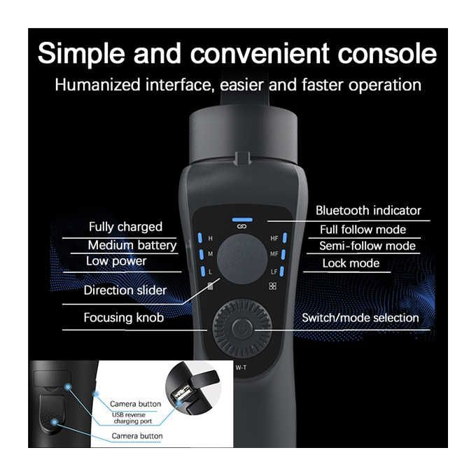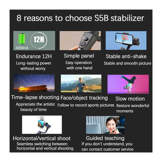 Main focusour store is updated daily. please pay more attention to our shop.We QC the products during shipment to ensure that the products are delivered to you with the best quality.@Golden snailDetailed descriptionProduct details of S5B 3 Axis Bluetooth Handheld Gimbal Stabilizer Cellphone Video Record Smartphone Gimbal for Smartphone Action CameraS5B 3 Axis Bluetooth Handheld Gimbal Stabilizer Cellphone Video Record Smartphone Gimbal for Smartphone Action Camera1. Supports smartphones weighing up to 8.8oz / 250g, and up to 3.35 inch / 82mm in height2.330 ° pan, 325 ° tilt, and 180 ° roll; Large, cine-style focus / zoom wheel with an indicator mark3. Dolly Zoom the effect of Vertigo, Multiple time-lapse and follow-mode choice;4.Up to 12-hour runtime (sleep time), able to charge for phone while shooting, support an external power pack5. Use with free, downloadable Gimbal Pro app to control select iOS / Android phone functions6. It support with android 5.0 or newer smartphone. And IOS. 10.0 or newer (such as iphone6 / 7/8/11 / s / plus / pro, iphone X / Xs / Xr / Max)Click on the rehmie icon to enter our store for more quality products Golden snail - Buy Golden snail Products Online - rehmie-------------------------------------------------Note: If you have any questions during installation and use, please consult the product manual or Google, there are plenty of tutorials available on YouTube.Due to the color of different products of various displays, there may be a little color difference from the picture, but it does not affect the use.Using: Work/travel/record/filming/vlog/YouTube/tiktok/photography/professional occasions...If you're not interested in this,You can open Golden snail shop and look at other products of the same type