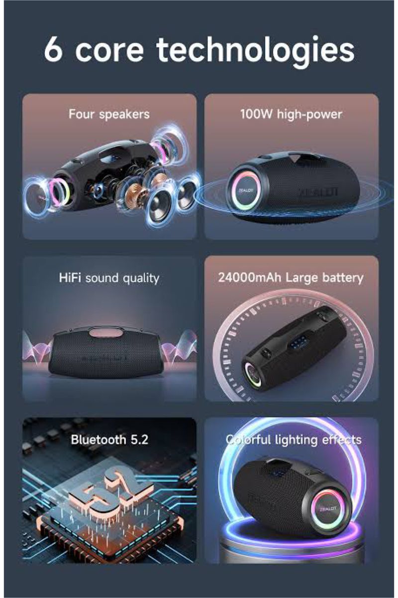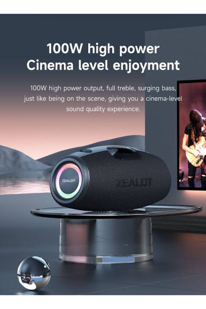 5W Bass with Dual Pairing - To achieve the incredible 100W, Zealot S78 comes with an exclusive custom 2 woofers and 1 tweeter. Combine with DSP chip for top of the line bass stereo effect. Crazy and shocking. In addition, it is equipped with a dual pairing function, like a live concert experience2.14,400 Mah Battery - More power, Better bass. What else? To support the perfect performance of the speaker, it uses a large capacity of 14,400 mah battery as the base of the speaker, up to 50 hours of playback time, and can charge phones, tablets and other devices while playing3.Different Sound Effects - On Sound, Zealot all the investment is worth it. You want clear voices? Or a more bass effect. EQ button for you to achieve, 4 sound modes, to meet your listening preferences. The clear and dynamic mode light changes allow you to use at willAre you still worried? - Best Bluetooth 5.2 technology, up to 200 feet of connection.