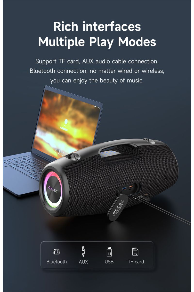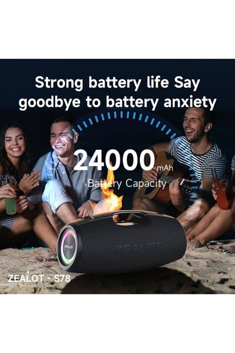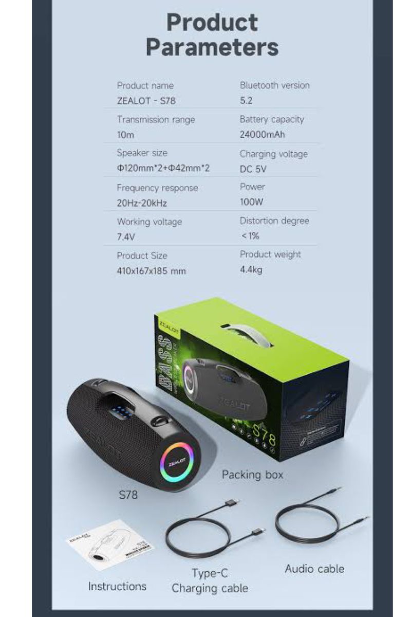 5W Bass with Dual Pairing - To achieve the incredible 100W, Zealot S78 comes with an exclusive custom 2 woofers and 1 tweeter. Combine with DSP chip for top of the line bass stereo effect. Crazy and shocking. In addition, it is equipped with a dual pairing function, like a live concert experience2.14,400 Mah Battery - More power, Better bass. What else? To support the perfect performance of the speaker, it uses a large capacity of 14,400 mah battery as the base of the speaker, up to 50 hours of playback time, and can charge phones, tablets and other devices while playing3.Different Sound Effects - On Sound, Zealot all the investment is worth it. You want clear voices? Or a more bass effect. EQ button for you to achieve, 4 sound modes, to meet your listening preferences. The clear and dynamic mode light changes allow you to use at willAre you still worried? - Best Bluetooth 5.2 technology, up to 200 feet of connection.