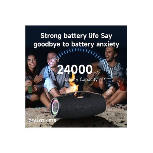 5W Bass with Dual Pairing - To achieve the incredible 100W, Zealot S78 comes with an exclusive custom 2 woofers and 1 tweeter. Combine with DSP chip for top of the line bass stereo effect. Crazy and shocking. In addition, it is equipped with a dual pairing function, like a live concert experience2.14,400 Mah Battery - More power, Better bass. What else? To support the perfect performance of the speaker, it uses a large capacity of 14,400 mah battery as the base of the speaker, up to 50 hours of playback time, and can charge phones, tablets and other devices while playing3.Different Sound Effects - On Sound, Zealot all the investment is worth it. You want clear voices? Or a more bass effect. EQ button for you to achieve, 4 sound modes, to meet your listening preferences. The clear and dynamic mode light changes allow you to use at willAre you still worried? - Best Bluetooth 5.2 technology, up to 200 feet of connection.
