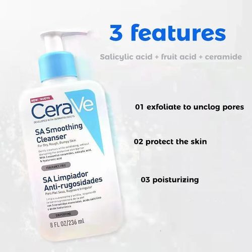 Developed with dermatologists, the rich formula of the CeraVe SA Smoothing Cleanser gently exfoliates the skin with Salicylic Acid, to smooth dry rough & bumpy skin. It contains 3 essential ceramides to help protect the skin's natural barrier. Hyaluronic Acid helps to retain the skin's natural moisture.