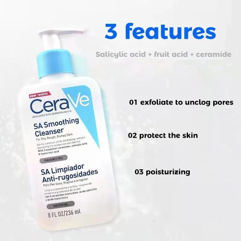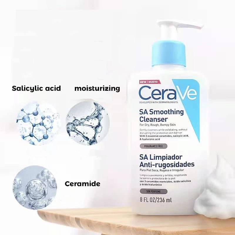 Developed with dermatologists, the rich formula of the CeraVe SA Smoothing Cleanser gently exfoliates the skin with Salicylic Acid, to smooth dry rough & bumpy skin. It contains 3 essential ceramides to help protect the skin's natural barrier. Hyaluronic Acid helps to retain the skin's natural moisture.