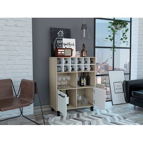 This bar cabinet will stand out in your room while providing great functionality to you. Its light colors will bring up your space; its 12 bottle cubbies offer a lot of storage space for your wine, the two shelves will give you space for decoration or glasses and two cabinets for concealed storage space, giving you all the storage you might need to entertain your guest.