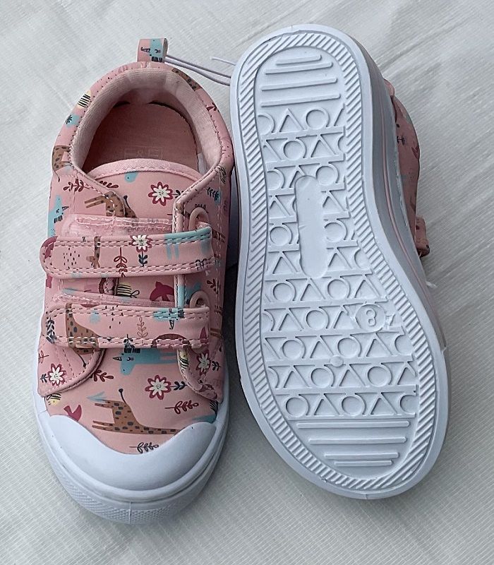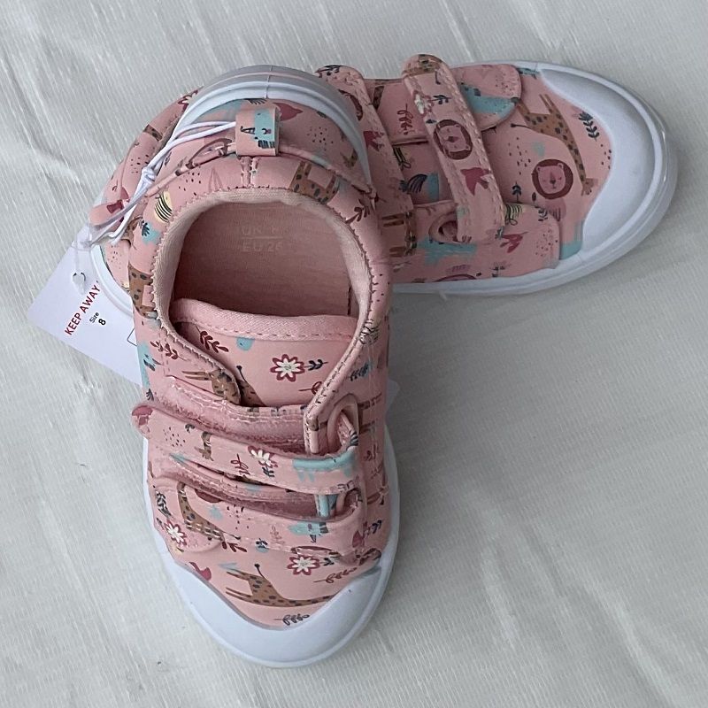 Safari print sandal for baby girls by F and F. Made in soft canvas, the uppers have a safari print finish. Lined in soft leather, they have a rubber sole and fasten with a velcro strap.