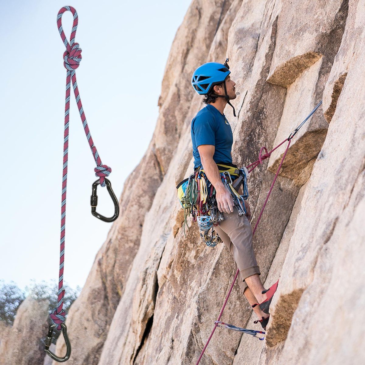 Abrasion-resistance, high strength and long lasting performance, durable, lightweight, heat resistantA friction hitch or knot used to attach a loop of cord around a rope, used for any friction hitch or device that can grab a rope, where you need any knot, make no / less damage to ropeBraided rope, high strength, less friction, lateral tension: 8KN, opening tension: 7KN, spindle tension: 24KNTwo colors self-locking carabiners hooks as you choose (Silver/Black) with great loading capacity at the end makes the lanyard never fall outWidely used for rock climbing, mountaineering, roofing, tree arborist, descending, hiking, downhill, fall protection, training, , rappelling, escape, working, caving, abseiling, survival, construction, canyoneering, and other outdoor activities