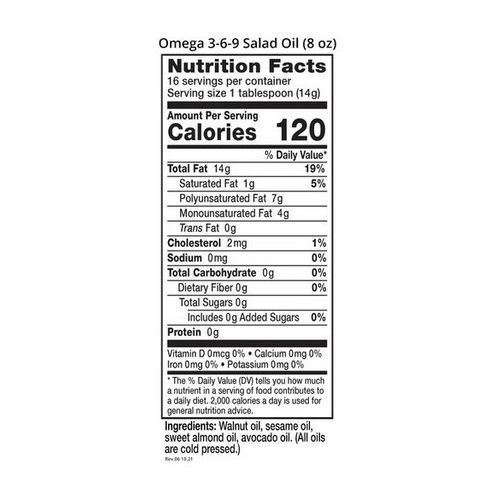 - Omega 3-6-9 Salad Oil is a premium blend of cold pressed walnut, sesame, sweet almond, & avocado oils. It has a delicate flavor & pleasing texture that enhances salad dressings, dips, sauces and cold dishes.