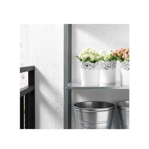 The plant pot is galvanised to protect against corrosion. The decorative embossing shows the size of the plant pot. It takes up little storage space since you can stack several plant pots in each other.