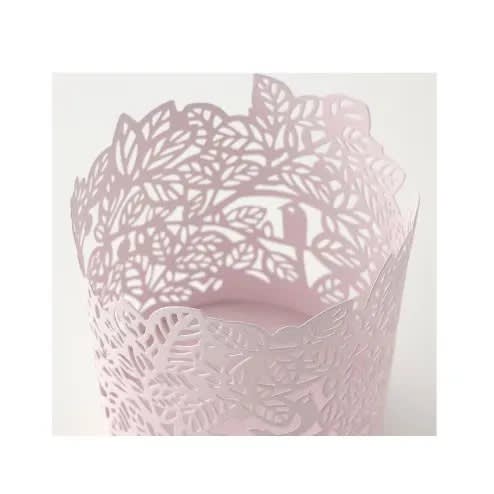 The warm light from the candle shines decoratively through the flowery pattern on the candle holder.
