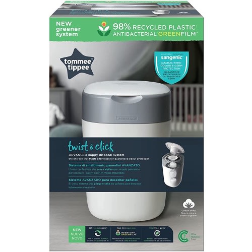 The only bin that twists and wraps for guaranteed odour protection. The Twist & Click nappy disposal bin provides guaranteed odour and germ protection to keep your home fresh and smell-free. This great value bundle includes one Twist & Click nappy bin with one pre-loaded refill cassette plus an additional pack of 6 refills.To reduce the impact on the environment The Twist & Click nappy bin and refill cassettes are made from 98% recycled and fully recyclable plastic. Our multi-layer antibacterial film is now bio-based and made from sustainably sourced sugar cane GREENFILM & trade;.The Twist & Click nappy bin is the only nappy bin to twist and individually wrap each nappy, safely sealing away odours and germs, keeping your home tidy and odour free. The multi-layer, anti-bacterial GREENFILM & trade; is 100x more effective than nappy sacks as it is Biomaster** protected to kill 99% of dangerous germs like E-coli and Staphylococcus Aureus. On contact it stops proteins being broken down by bacteria, a process responsible for lots of nasty smells. The smart sealing lid encloses all unpleasant odours and the inbuilt plunger pushes nappies deep into the bin, keeping your hands clean.Despite its compact size, the Twist & Click nappy bin can hold up to 28 nappies* at once, meaning fewer trips to the outside bin. The flat lid opens against any wall, making it easy to position and use. This great value bundle includes one Twist & Click nappy bin with one pre-loaded refill cassette plus an additional pack of 6 refills. Each refill provides enough anti-bacterial film to wrap up to 1 months & rsquo; worth* of nappies depending on the size and number you use. For optimum performance and guaranteed protection against odours and germs, we recommend using Twist & Click branded refill cassettes in your Twist & Click nappy bin. Please note that the Twist & Click nappy disposal system is only compatible with the Tommee Tippee Twist & Click refills. Sangenic TEC & Simplee Sangenic refill cassettes are not compatible with this bin.