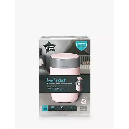 The only bin that twists and wraps for guaranteed odour protection. The Twist & Click nappy disposal bin provides guaranteed odour and germ protection to keep your home fresh and smell-free. This great value bundle includes one Twist & Click nappy bin with one pre-loaded refill cassette plus an additional pack of 6 refills.To reduce the impact on the environment The Twist & Click nappy bin and refill cassettes are made from 98% recycled and fully recyclable plastic. Our multi-layer antibacterial film is now bio-based and made from sustainably sourced sugar cane GREENFILM & trade;.The Twist & Click nappy bin is the only nappy bin to twist and individually wrap each nappy, safely sealing away odours and germs, keeping your home tidy and odour free. The multi-layer, anti-bacterial GREENFILM & trade; is 100x more effective than nappy sacks as it is Biomaster** protected to kill 99% of dangerous germs like E-coli and Staphylococcus Aureus. On contact it stops proteins being broken down by bacteria, a process responsible for lots of nasty smells. The smart sealing lid encloses all unpleasant odours and the inbuilt plunger pushes nappies deep into the bin, keeping your hands clean.Despite its compact size, the Twist & Click nappy bin can hold up to 28 nappies* at once, meaning fewer trips to the outside bin. The flat lid opens against any wall, making it easy to position and use. This great value bundle includes one Twist & Click nappy bin with one pre-loaded refill cassette plus an additional pack of 6 refills. Each refill provides enough anti-bacterial film to wrap up to 1 months & rsquo; worth* of nappies depending on the size and number you use. For optimum performance and guaranteed protection against odours and germs, we recommend using Twist & Click branded refill cassettes in your Twist & Click nappy bin. Please note that the Twist & Click nappy disposal system is only compatible with the Tommee Tippee Twist & Click refills. Sangenic TEC & Simplee Sangenic refill cassettes are not compatible with this bin.