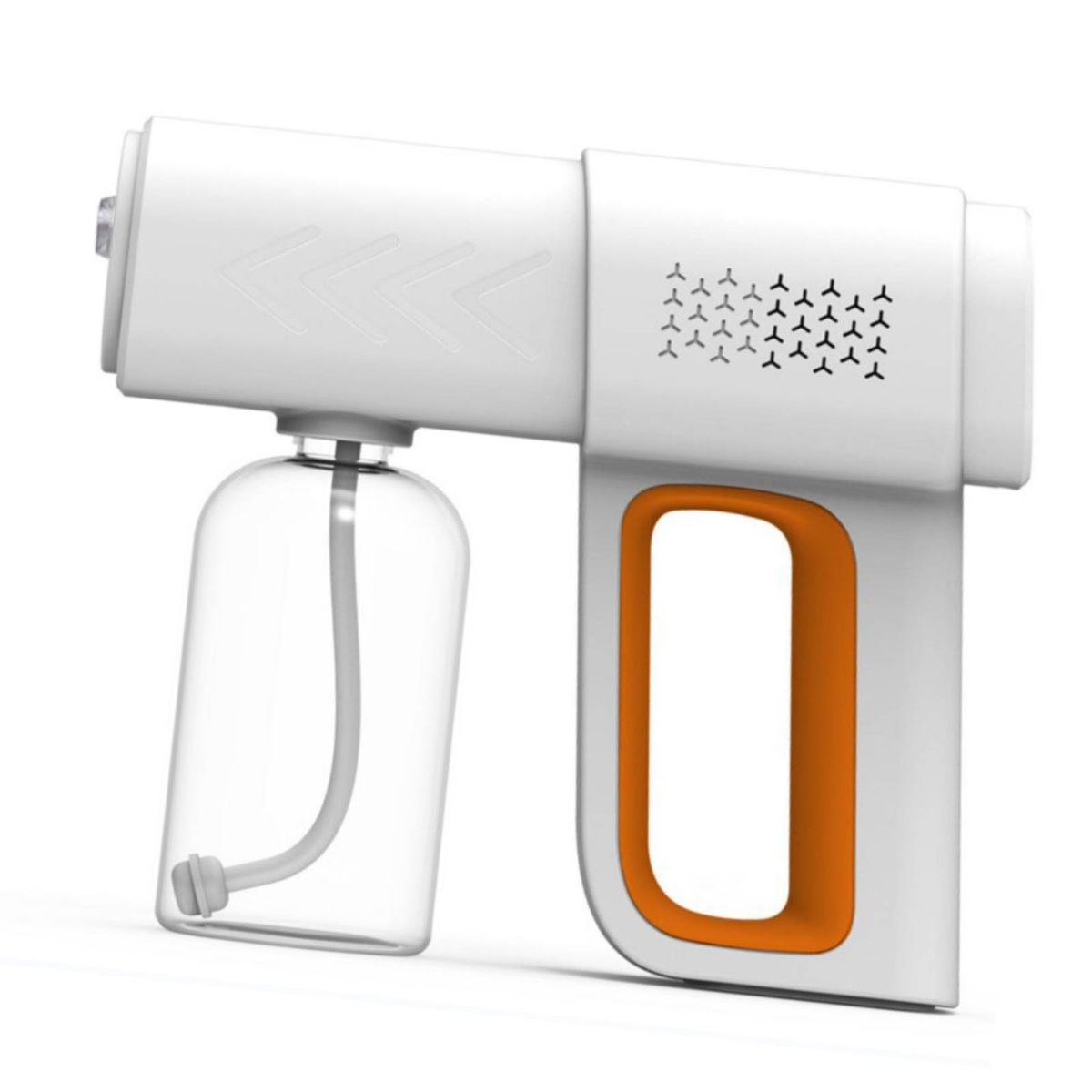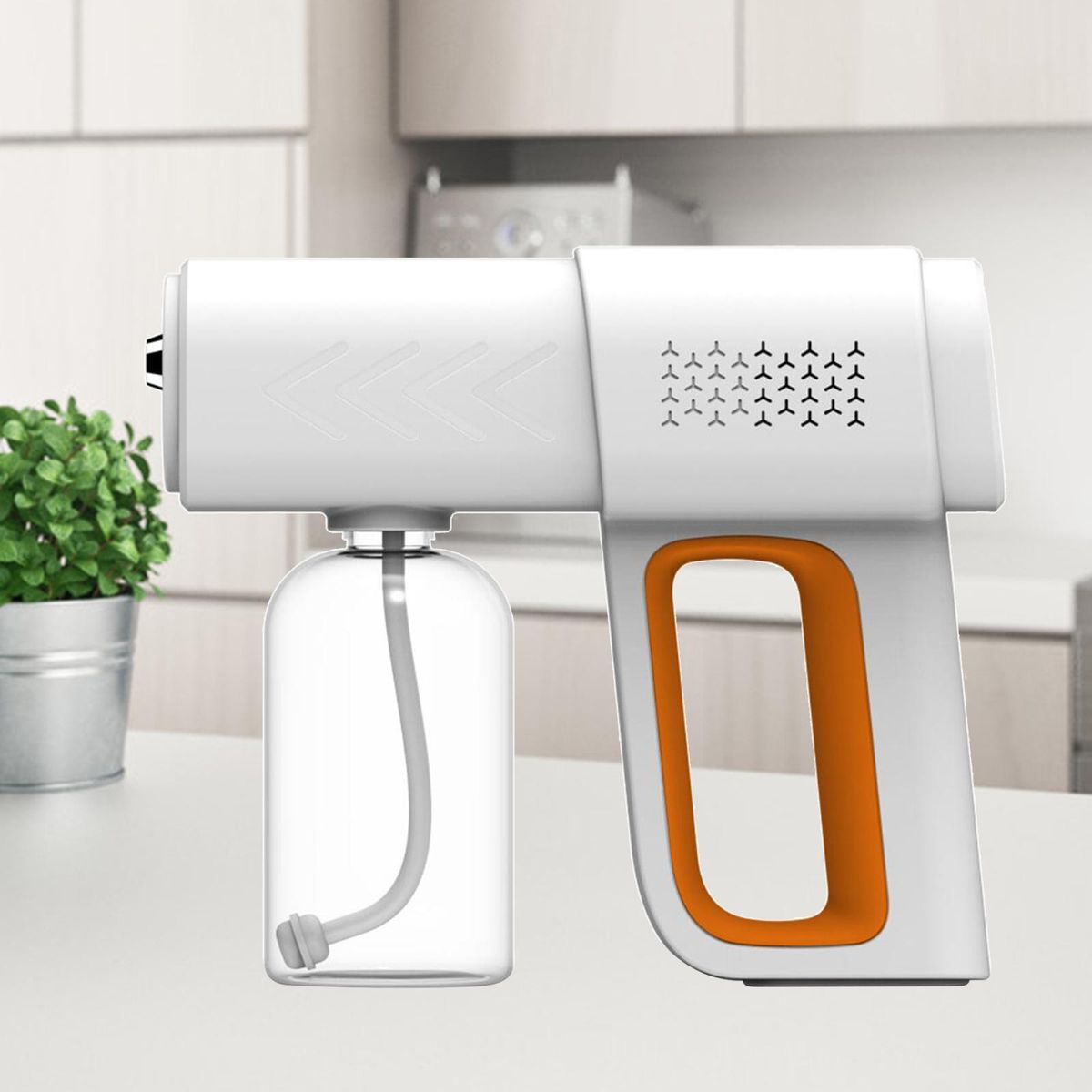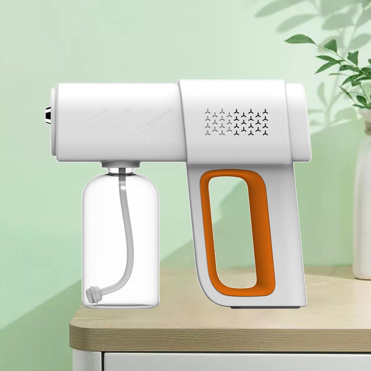 With anti-clogging nano-level nozzle, it also uses strong blue light to effectively assist the cleaning function.The spraying distance is up to 1.5 meters, and it can be sprayed directly on the surface of the human body, fabrics, home appliances, etc.Great help for daily environmental sanitation and disinfection, it can also replace indoor humidification, , water replenishment, watering devices.With 1600mAh lithium battery, which can be used continuously for 1H . We are equipped with a charging cable, which can be fully charged in about 2HEquipped with a 380ml container, this weight design is convenient for men and women to operate, you will not feel sore in your when operating for a long time