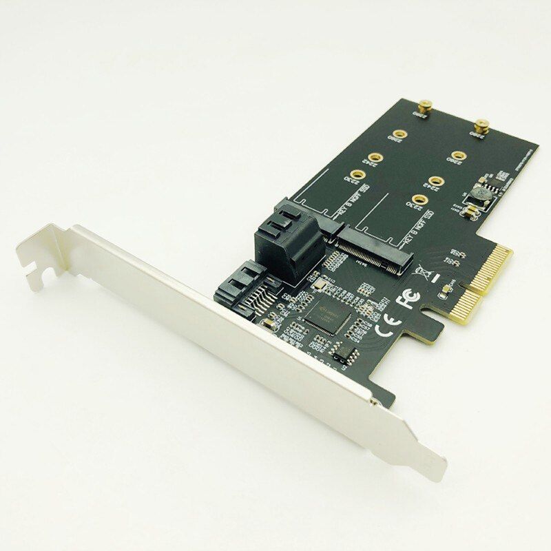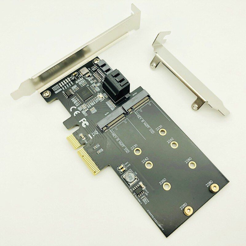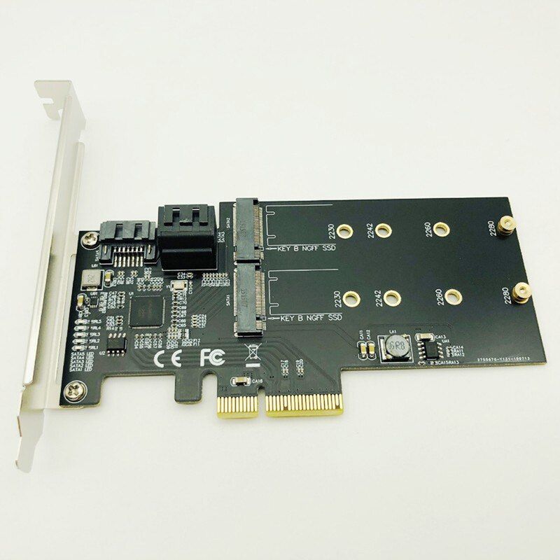 Product Specifications: Product Name: PCI-E 4X to 3P SATA3.0 & 2P M.2 B-Key Riser Expansion interface1: 3*SATA 3.0 (6Gbps) Expansion interface2: 2*B KEY (full speed PCI-E 4X) Support SSD Size: Support 2230, 2242, 2260, 2280 M.2 SSD Support slots: PCIE X4, Compatible with PCI-E X4/X8/X16 Supported operating syst: For Windows, MAC, Linux.