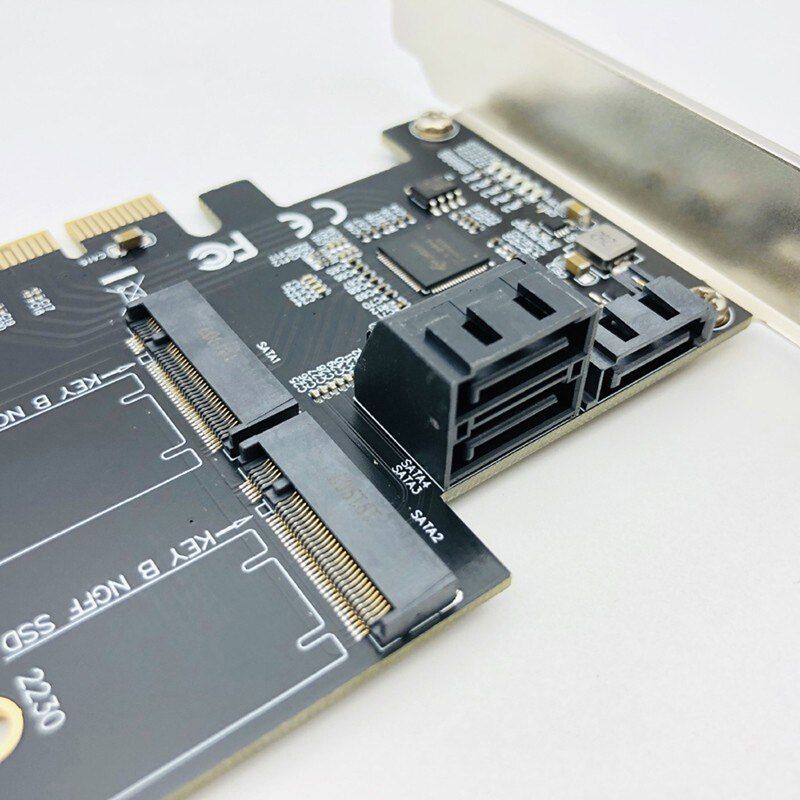 Product Features: 1. Rich interface, one slot can expand 2 M.2 (SATA protocol) interface + 3port SATA3.0 interface. 2. New JMB585 with high compatibility and high stability 3. Support Plug and Play. Fixed SSD copper studs are removable and support 2242, 2260, 2280 size M.2 SSD 4. New cooling module design, strong heat diipation 5. Gold finger is fully gold plated, which is more wear resistant and increases electrical conductivity.
