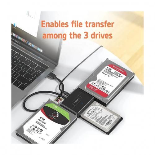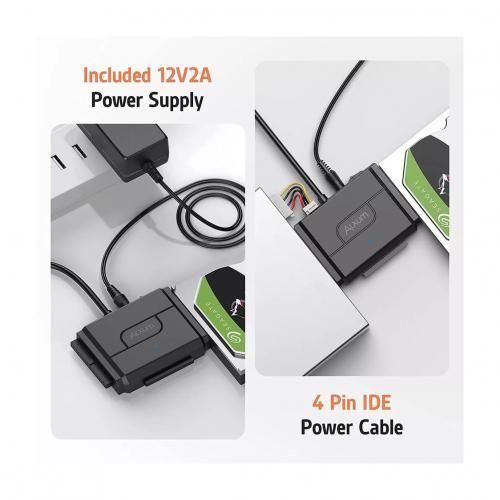 Alxum IDE SATA to USB adapter, hard drive connector for Universal 2.5 & 3.5 IDE SATA HDD SSD, 5.25 DVD optical drive, support 3 drives connection with 12V power adapter, 4pin cable, and USB A cable. Alxum SATA IDE adapter is the perfect data access and transfer tool, plug and play.