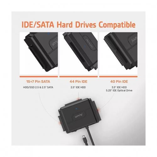 - 3-in-1 Universal Hard Drive Converter - Alxum SATA IDE to USB adapter with 2 x IDE connectors (40pin and 44pin) which for 2.5 & 3.5 inch IDE HDD or SSD, 5.25 inch DVD-ROM, CD-ROM, CD-RW, DVD-RW, DVD+RW Optical, Blu-ray Drive, Plus 1 x SATA II 22pin connector for 2.5 & 3.5 inch SATA SSD HDD.