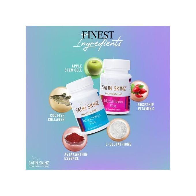 Satin skinz gluta tabs is the first product of its kind that combines the best of natural herbs and ingredients to give an awesome result without the ingredients conflated. With glutathione plus and astaxantine plus as the main ingredients, colagen sourced from deep sea fish, rose hip, cinnamon and many more super natural occurring ingredients thereby making it 6000 times stronger than the best of vitamin Cs and 400 times better than bcarotene. satin skinz gluta tabs delivers 7 times better skin by neutralising radicals that comes in contact with skin to cause skin damage and consequently lightening, brightening and glowing the skin, reducing the aging process, stimulates the growth of new and improved skin cells, Eliminating scars and wounds, rejuvenating skin throughout the whole body, strengthening joints and bones, protects skin from harmful UV rays, increasing the natural production of colagen in the body giving you that bright, fair and supple skin you desire. Gluta tabs is produced in a GMP facility , adhering to all production standards and quality controls measures and it is also approved by all relevant institutions and bodies thereby making it suitable to be taken by all persons.