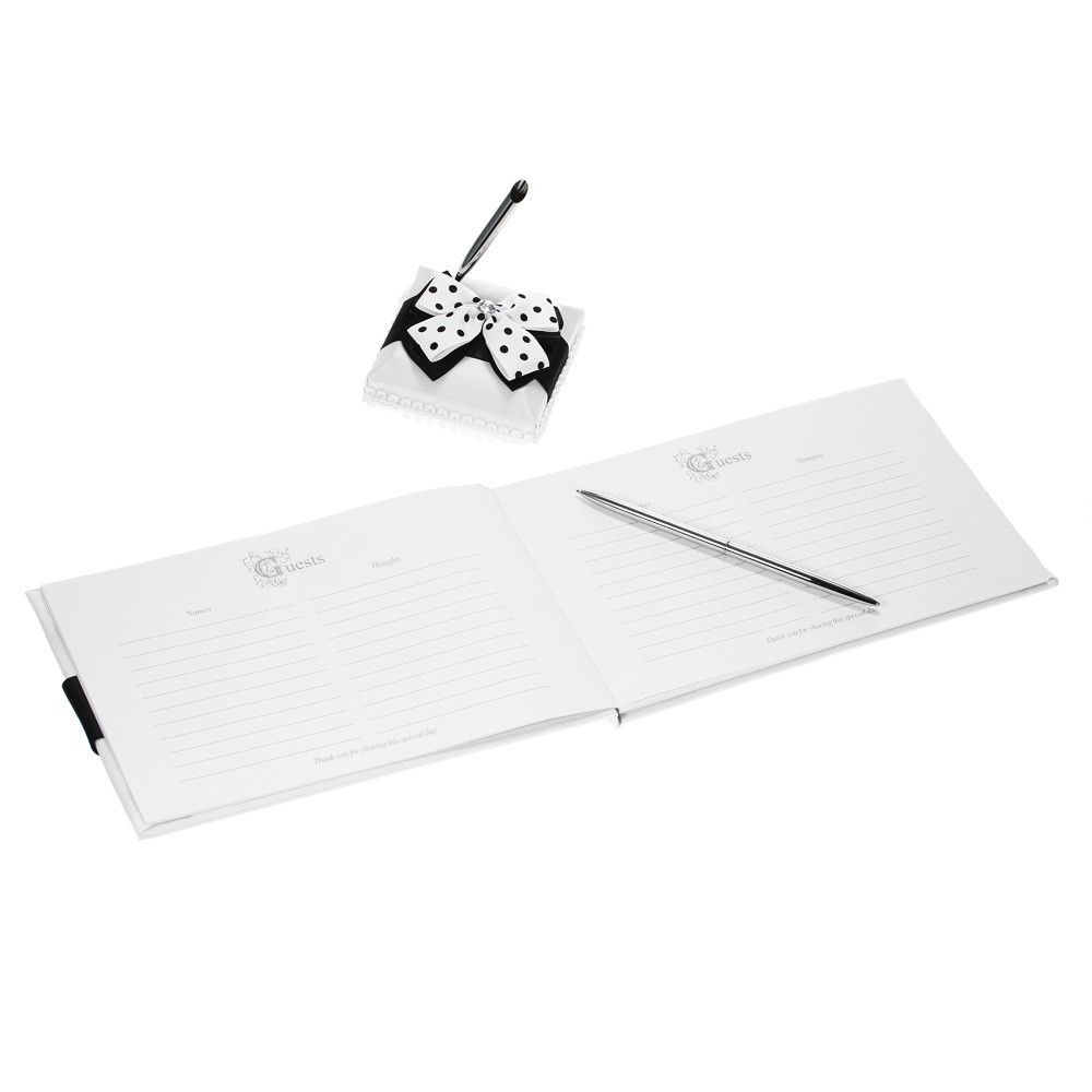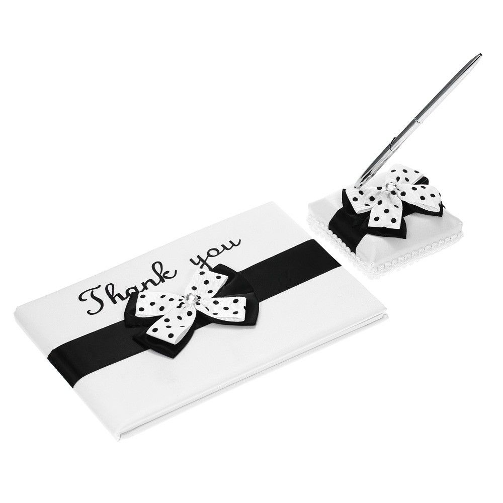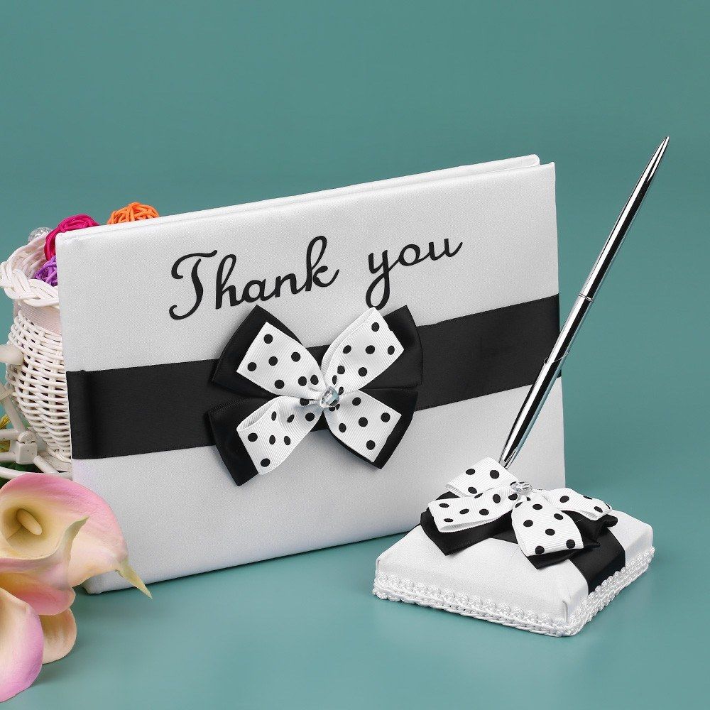 This guest book and pen set is a beautiful keepsake of your special day! Both of them are decorated with white amp; black bowknot. Elegant wedding supplies!