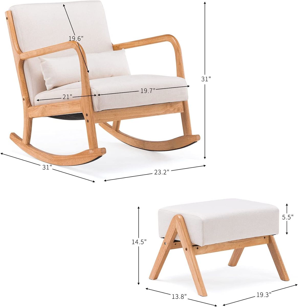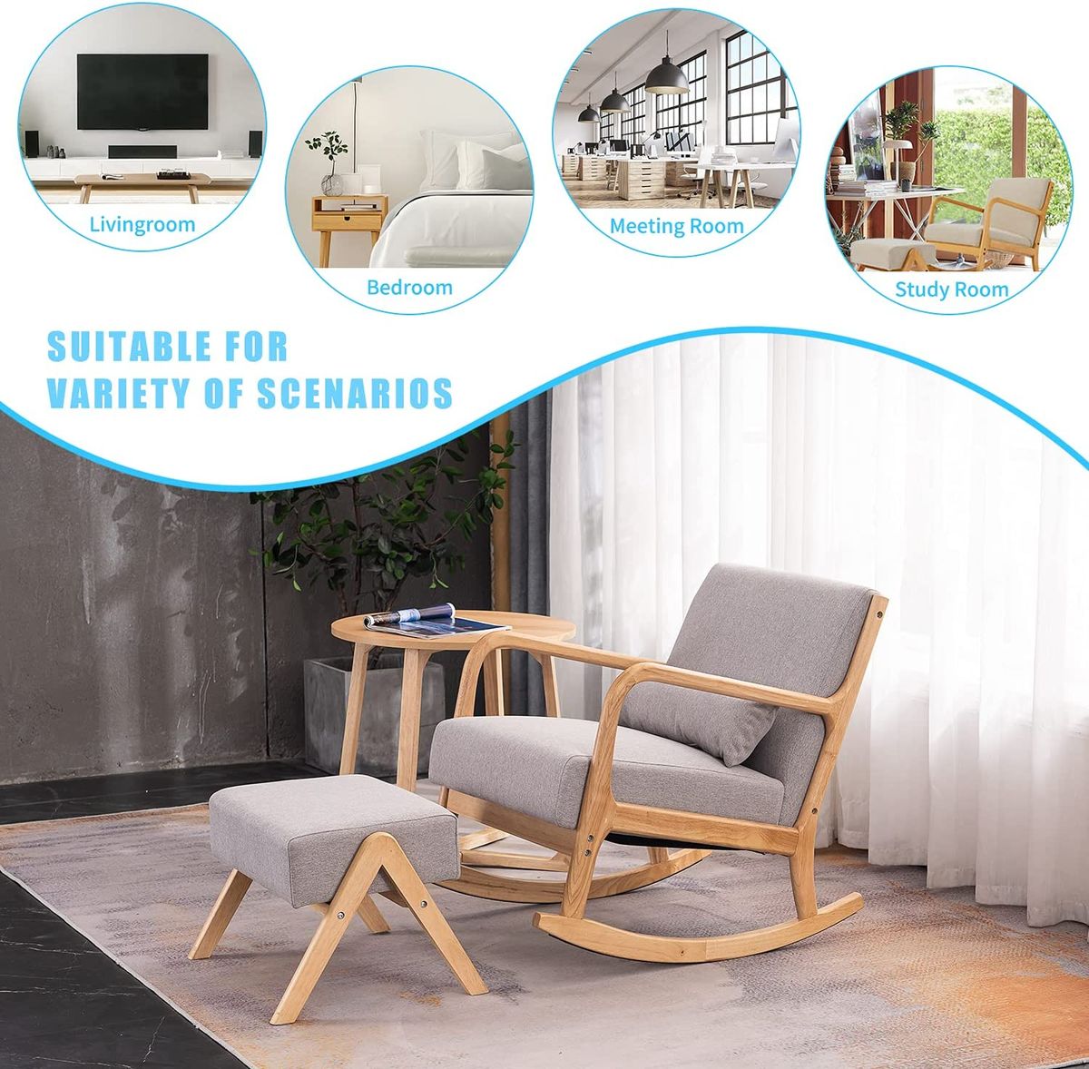 The fabric covers of the back and footrest are made of cotton and linen. The comfortable material is wear-resistant and skin-friendly, and it is also very easy to clean. The 5-inch thick foot pads and internal high-density sponge design make the entire rocking chair for nursery soft enough. This greatly improves comfort and allows you to relax after a tiring work.