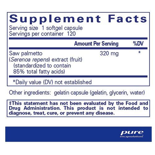 Throughout the world‚ an herb called saw palmetto has been used by men to support their overall well-being. Specifically‚ it works to support the prostate. Your prostate is a gland that produces semen‚ and it surrounds the tube that carries urine out of the bladder in order to eliminate liquid waste. Saw Palmetto 320 by Pure Encapsulation promotes the healthy metabolism of testosterone‚ which is the primary male sex hormone. Testosterone levels may decline with age; therefore‚ a lack of testosterone may be related to the increased chance that older males have of developing an enlarged prostate. The prostate is normally supposed to be walnut-sized. In addition‚ the saw palmetto extract in Saw Palmetto 320 works to support the urinary tract. This is because it may alleviate symptoms associated with benign prostatic hypertrophy (BPH). While it typically isn't a sign of more serious health problems‚ an enlarged prostate can put increased pressure on the urethra; as a result‚ you may feel the need to urinate more frequently--having to wake up and go to the bathroom at night is common. Another common--and sometimes embarrassing--indication of BPH--is dribbling after urination. Every softgel of Saw Palmetto 320 contains 320 milligrams of Serenoa repens (saw palmetto) fruit extract. This extract has been standardized to ensure that it provides sufficient levels of active compounds: 0.15 percent phytosterols and 85 percent total fatty acids. Phytosterols are plant sterols that may support cardiovascular health by latching onto cholesterol receptors in the intestines. Take one or two softgel capsules daily‚ in divided doses between meals. At the recommended dosage‚ each 120-softgel bottle of Pure Encapsulations' Saw Palmetto 320 should last from two to four months. Pure Encapsulations seeks to formulate and manufacture high-quality‚ hypoallergenic dietary supplements. Quality control during the formulation and manufacturing process is paramount. All Pure Encapsulations products are made with the most bioavailable ingredients possible.