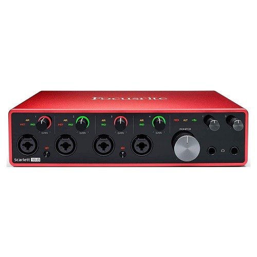 The interface comes with a complete recording toolkit with Pro Tools Artist, Ableton Live Lite, and Focusrite's Hitmaker Expansion software bundle; featuring Auto-Tune Access for Vocals, Softube Marshall Silver Jubilee 2555 for guitar, Native Instruments MASSIVE synth, and more.