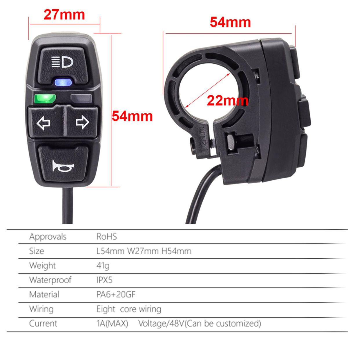 Universal switch, install hole diameter 22mm.