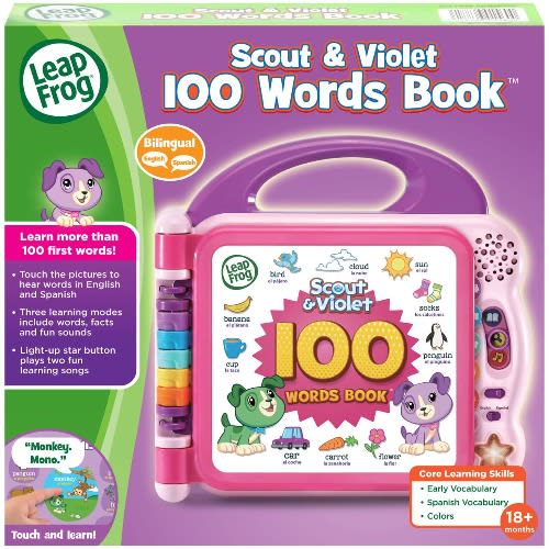 Join Scout and Violet as they explore new vocabulary in this LeapFrog Online Exclusive Scout and Violet 100 Words Book. Explore the colorful pages and touch each picture to hear them say toddler-appropriate words along with exciting facts and sound effects. Immerse your child in bilingual play by sliding the language switch to hear the words, songs and instructions in Spanish. Touch the pictures to hear silly sound effects in Fun Sounds mode or press the light-up star button to hear two learning songs. Discover new vocabulary with Scout and Violet!