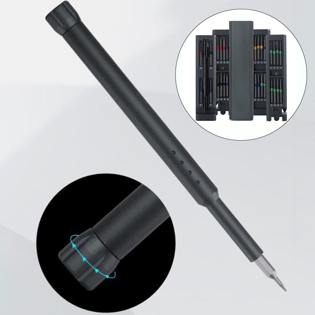 Small size, easy to store and portable.It is equipped with 28 different batch heads, a screwdriver, a tweezers, and a prying machine list, which is multi-functional.Push-type design, convenient and quick to use.Inner lining design on four sides, magnetic fixed bit, don't worry about the batches scattered around.Suitable for various daily necessities such as home maintenance, mobile phones, toy cars and watches, precision maintenance.