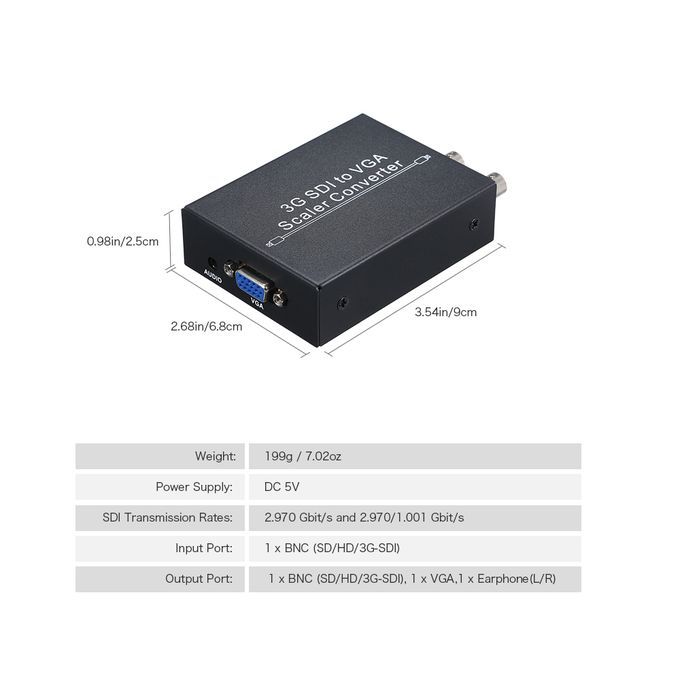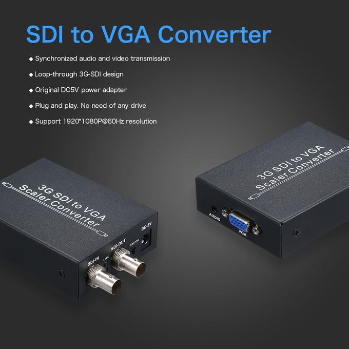 The SDI to VGA scaler converter allows SD-SDI, HD-SDI and 3G-SDI signals to be shown on VGA displays while ensuring high bit rates of 2.970 Gbit/s to give you signal transmission without any loss. For professionals this means that it is now easier to distribute and extend your 3G SDI signal while giving you the ability to display your work on VGA displays thanks to the built in this converter. Furthermore, thanks to the loop-through 3G-SDI design, users are able to enjoy both SDI and VGA at the same time.