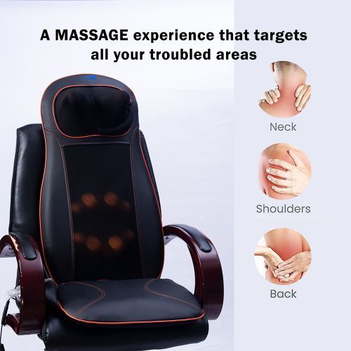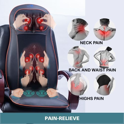 Neck and back seat Massager for Women and Men. a flexible massage pillow replaces traditional rough massage nodes, fits perfectly behind your back and neck; The massage pillow is placed vertically to fit all members of your family regardless of your heights.the neck and back seat massager has deep kneading massage nodes, travel up and down relaxing your entire back. different back massage zones for your choices: Full/Upper/Lower back. Back Position: Allows you to concentrate the kneading on the area selected for pin-point relaxation. the neck and back massager is fitted with Soothing Heat Therapy and Seat Vibration. Heating on neck and back warms your neck and back while relaxing tense muscles across your entire neck, back, lumbar, and shoulders. Vibration on the seat with adjustable levels of intensity, provides you a comfortable massage to Hip and thighs. the neck and back seat massager is the Ultimate Comfortable Back Massager for Chair. Use this back massager on a sofa, couch, recliner, office chair, or dining chair to make the ultimate comfort seat in the house. The integrated strapping system secures it on chairs in place. High-quality polyurethane leather makes it durable, easy to clean, and maintain.