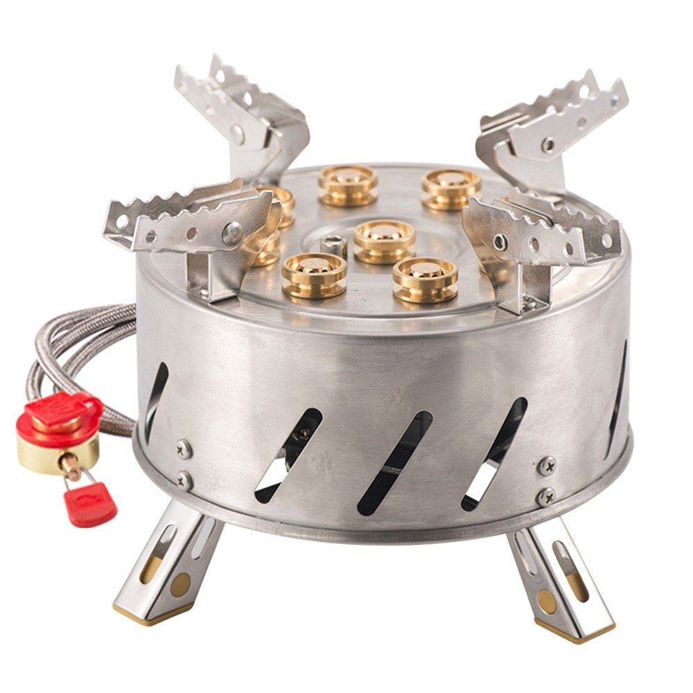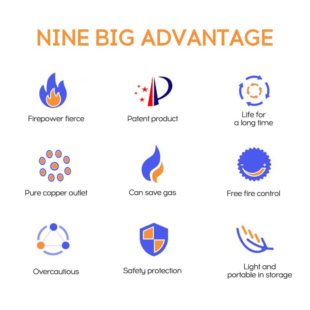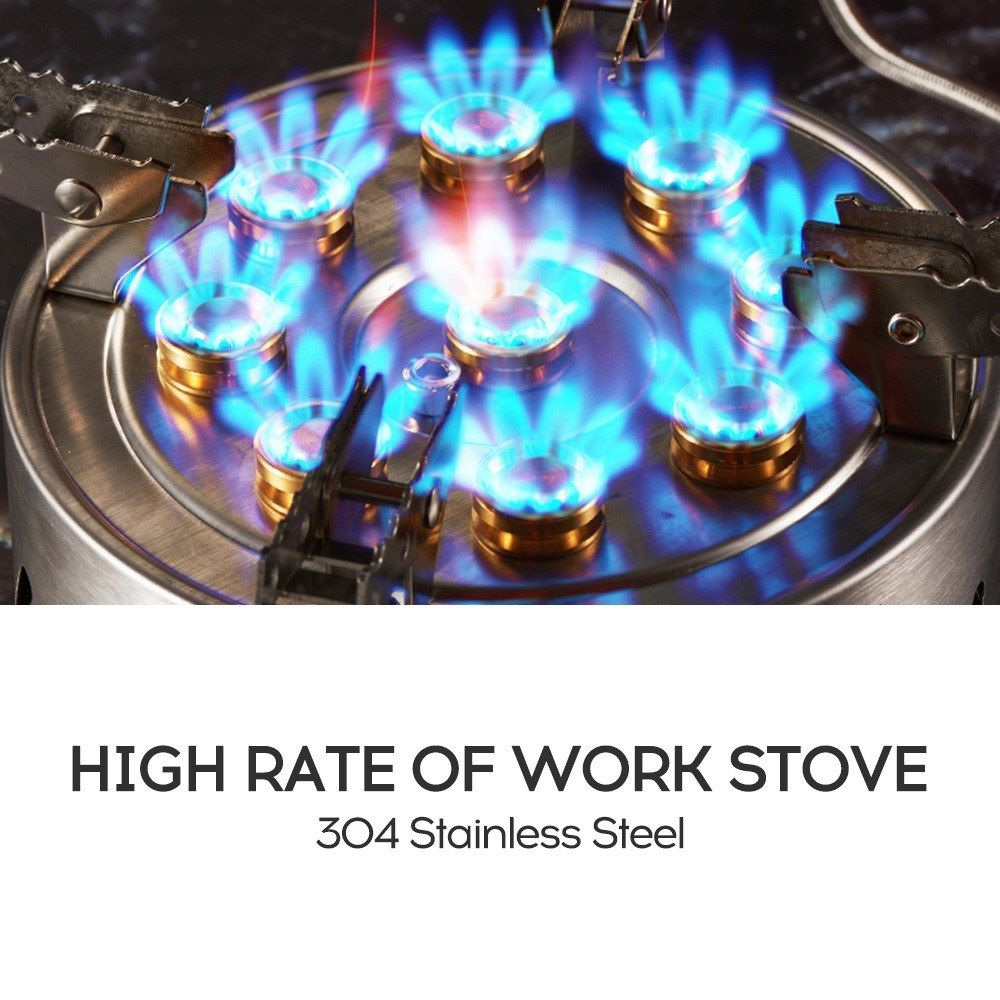 The stove is made by high quality stainless steel, high hardness, heat-resistant. Collapsible design, space saving to carry and suitable for various of outdoor activites. 9 fine copper fire hole, adjustable fire, gather and save energy.