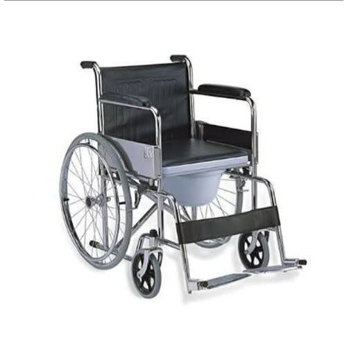 andard Commode Wheelchair is a simple type of wheelchair with commode that can give you the independence on your mobility & other daily routines. The wheelchair has a self-contained & removable & plastic commode pail, or you can position the chair over a toilet. The chair comes with durable steel frame with powder coated finish. The chair comes with flip down armrests & detachable footrests. The padded upholstery is made of PU that is durable and comfortable. User propelling wheelchair with integral commode. Comprises stainless steel frame; front castors; rear wheels with lever brakes; rear tipping levers; individual swing away, detachable footplates; seat cushion with front cutaway; front loading commode pan; padded armrests and individual push handles.