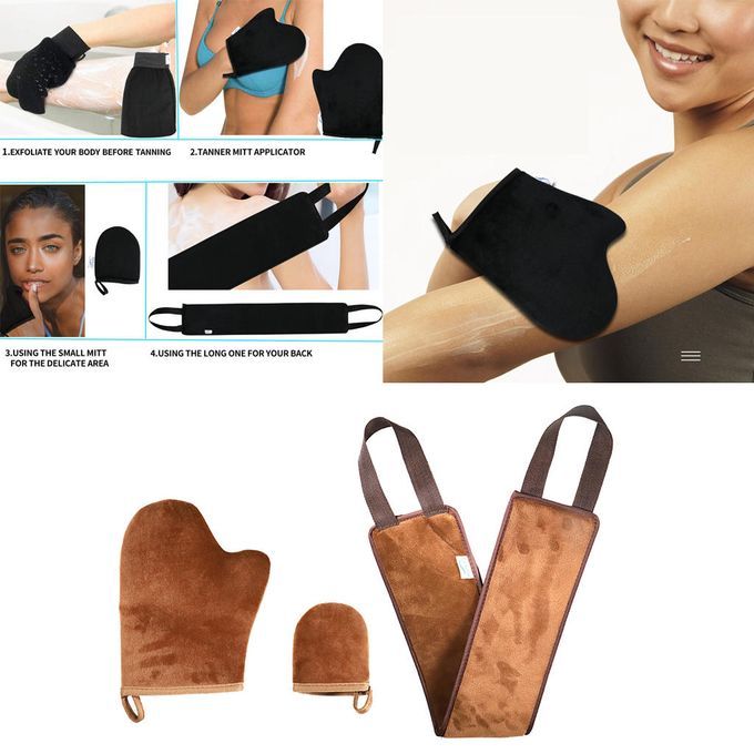 3 in 1 Tanning Mitt Set, which includes 1 tan mitt applicator, 1 mini face mitt, and 1 back applicator for back, meet your different requirement.