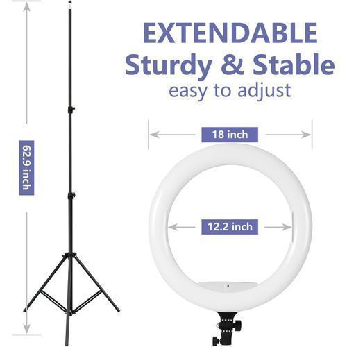 Ring Light Description - Adjustable Brightness Modes - Dimmable 18 inch ring lights with a wide dimming range from 1%-100% can provide you with perfect light and shadows to work, read or makeup. And 3 modes to meet all your needs of portraits, vlog, live streaming and selfie.