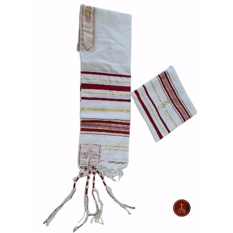 This Tallit now comes in Ancient Messianic Symbol printed on the four corners with 4 different scriptures on each corner. The Atarah (The Collar) has the Messianic Symbol in gold mettalic on both sides and has a Messianic prayer in Hebrew which says: "Blessed are you O' Lord King of the Universe Who has fulfilled all of the law through Yeshua the Messiah and has covered us with His righteousness". The Hebrew Pronunciation is: "Baruch Atah Adonai El Ohenu Melech Hai Olam Asher Milla Et Kol Ha Torah B'Yeshua Ha Mashiach Ikissa Et Kulanu Vetsedkato" .