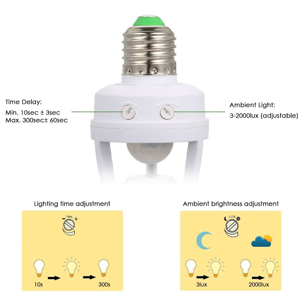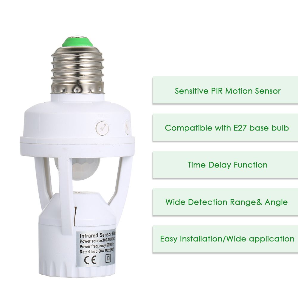 This E27 PIR motion sensor light control lamp holder adopts sensitive detector, integrated circuit. It gathers automatism, convenient, safe, and practical function. It utilizes the infrared energy from human as control-signal source, it works at once when one enters detection field. Easy to install and use widely.