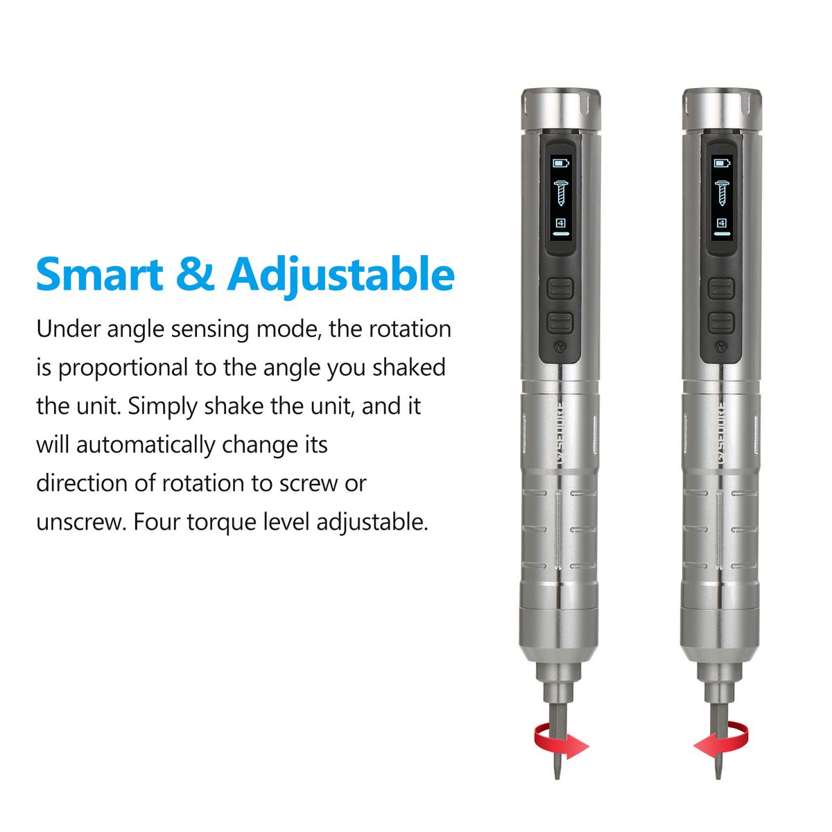 Smart amp; Adjustable -- Under angle sensing mode, the rotation is proportional to the angle you shaked the unit. Simply shake the unit, and it will automatically change its direction of rotation to screw or unscrew. Four torque level adjustable.